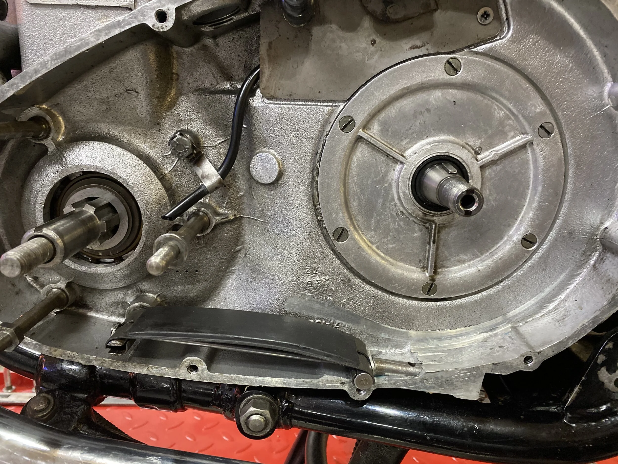 The bowl or tray at the top of the picture collects oil sprayed from the primary chain and then channels it down to the primary gear giving it some extra lubrication…..the hole worn by the chain isn’t a huge concern but I will replace that pipe.