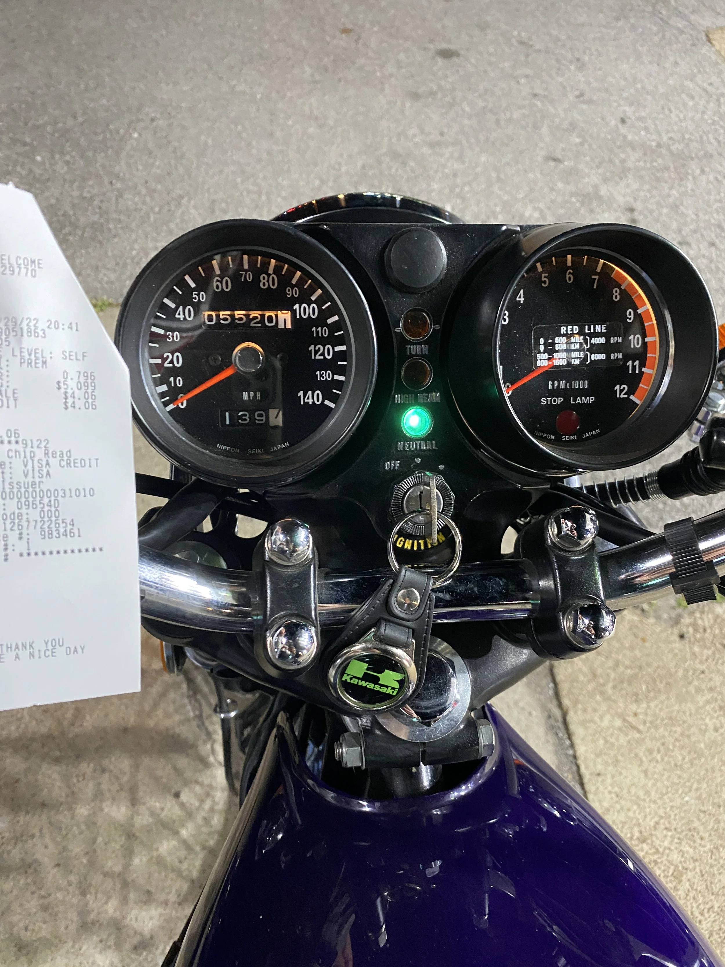 It took me awhile to get to these. Despite new cables both the speedo and rev counter had very wavy needles. I sent them to Don Fulsang in FLA for a full refurb. He determined that the rev counter was in fact from an H1….the difference being the redline on the H2 rev counter should start at 7500 rpm rather than 9500 rpm…new H2 faceplate is the only alteration to bring it up to spec.