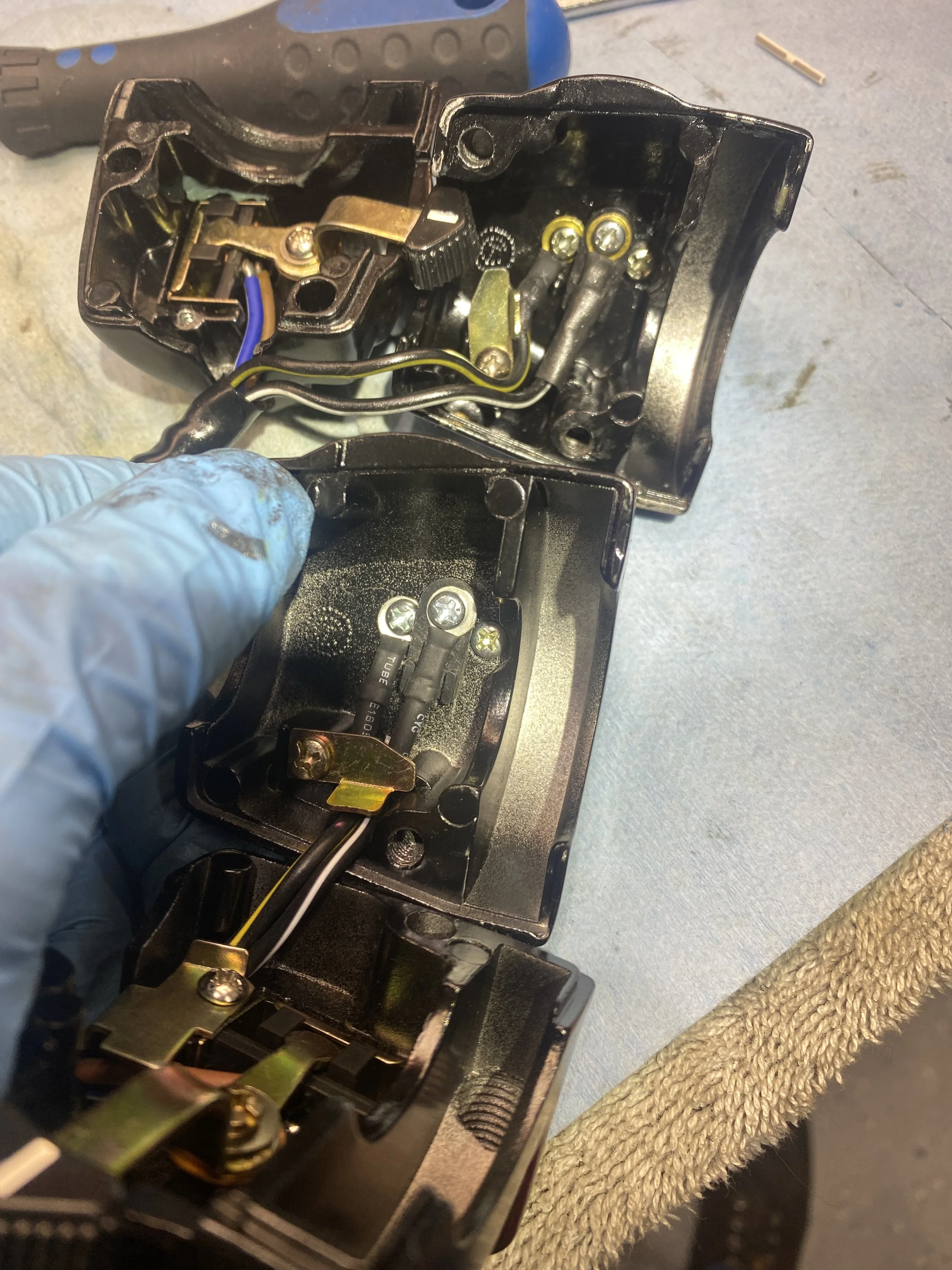 Before I accepted a new one was the only answer I double checked the wiring from the switchgear to the block in the headlamp. Unless you want to strip the protective sleeve (which I declined to do), all you can really do is check the connections at both ends. Insulation on everything I could see was continuous and unbroken. Nothing to see there. Move along to the new one.