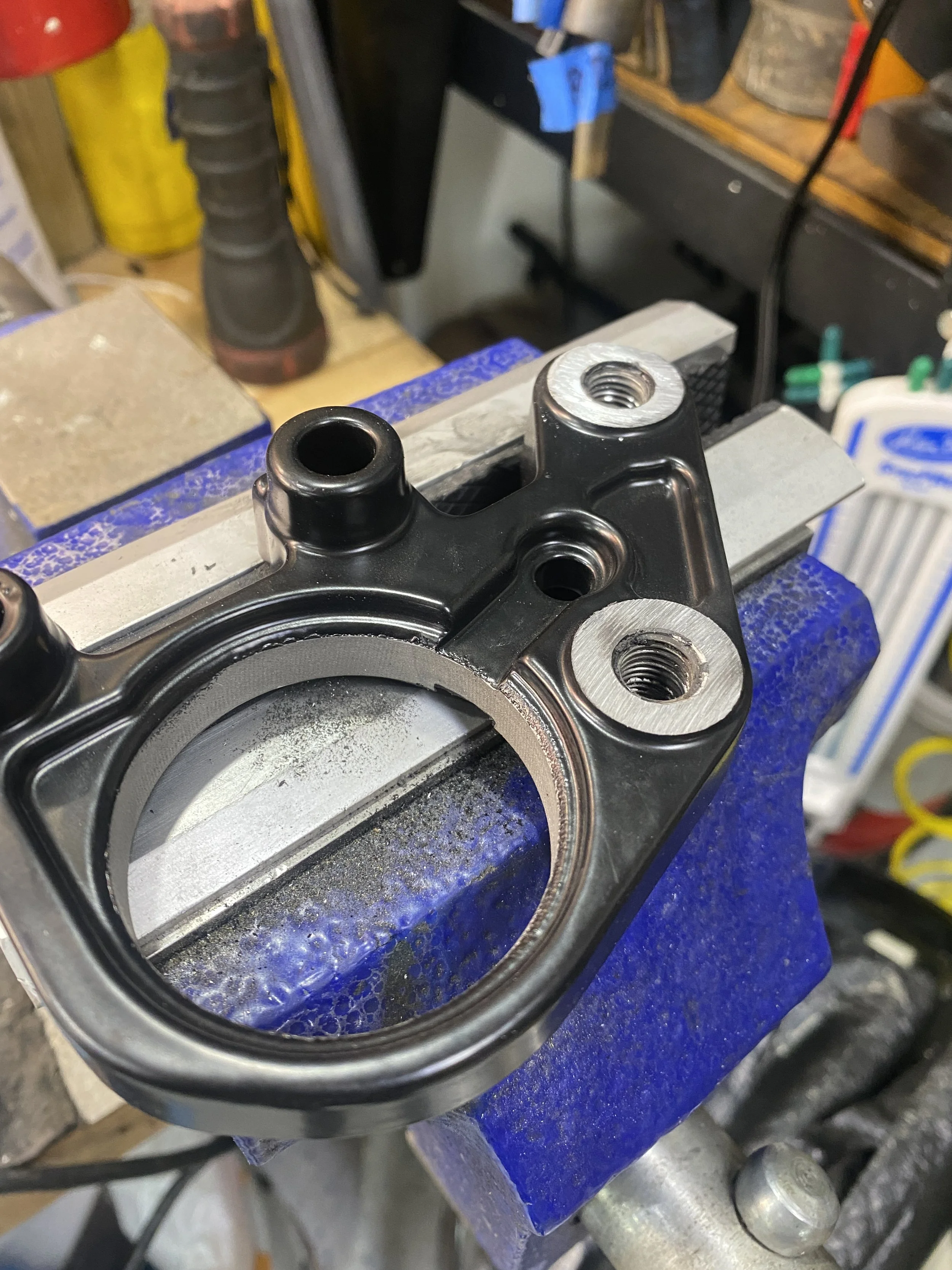 Removed the coating from these places to allow the caliper holder slide into the fork bottoms. The inner ring where the pad sits had been carefully masked by the coaters.