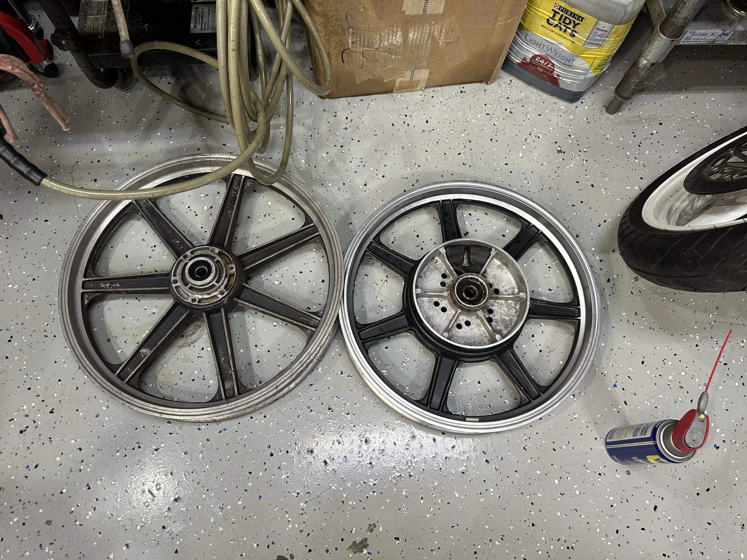 Takasago....original rims. The front had a little hop.....but Ryan was able to fix and it wasn't afflicted with the rust as much has the back so it was allowed to stay. One DID rim from Z1Parts and stainless steel spokes from Buchanans ended up around $225