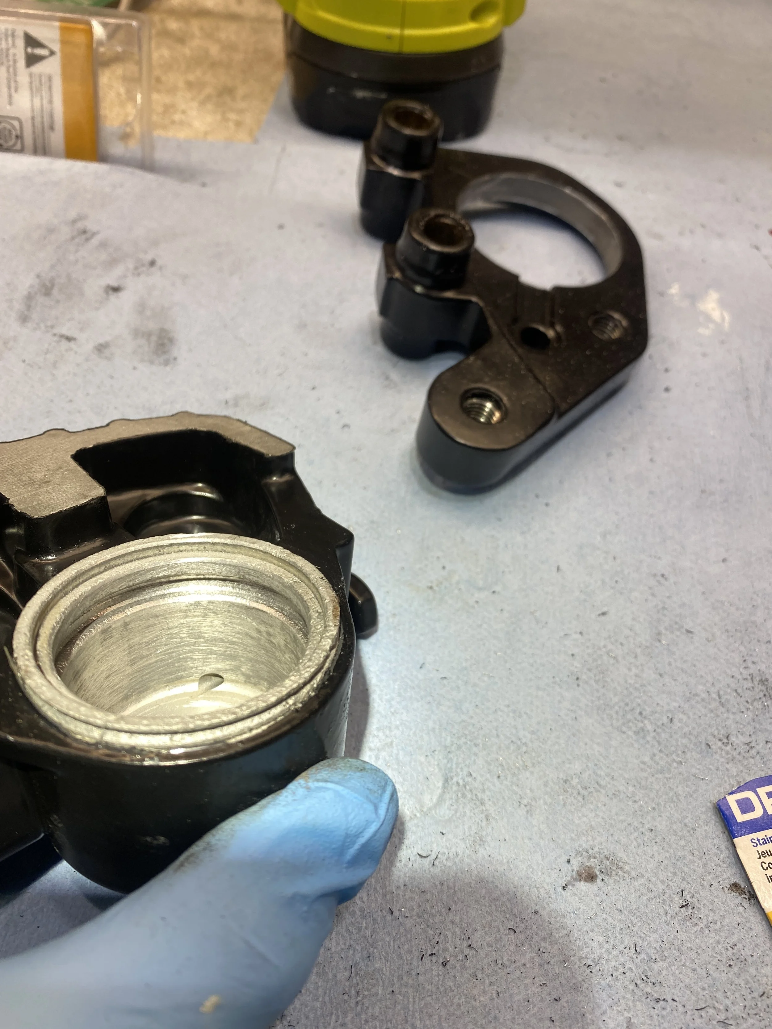 To convert a left to a right hand caliper, (and this is NOT a lesson on how to do it- only a description of what I did) I firstly got hold of a left hander from Danny at triplestuff.net. (dhg1337@gmail.com). To remove the piston, at first I carefully tried compressed air (have heard horror stories of that gone wrong) but no joy, so I had to hook up the caliper to an existing working brake system and pump it out. As you can see someone tried the grease gun method.