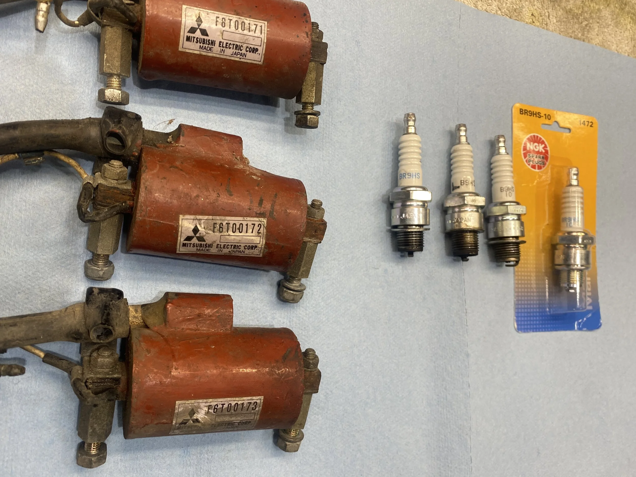 3 original coils and four different spark plugs. In my defence (been saying that a lot lately) I remember now that the New In Box plug was one of 10 I had ordered that were advertised as B9HS’s not BR9HS’s. Seller became MIA when I tried to return them. Bearing in mind this bike has had all its electronics replaced: Rewound stator from Rex New coils from Jess New CDI from Lakeland NOS rectifier New switchgear (killswitch) came with bike. It’s a bit of a mystery and a little annoying considering I did all that work to make it more reliable. Bikes eh?