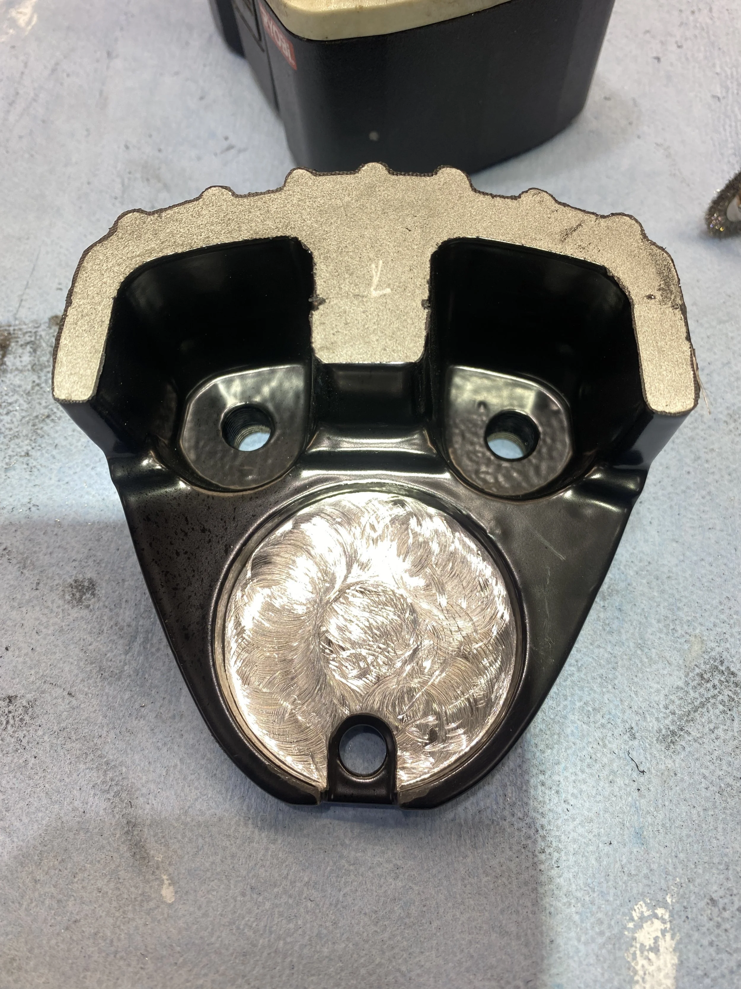 Removed the coating in the pad seat here just to ensure that when I get brand new pads one day, they will fit.