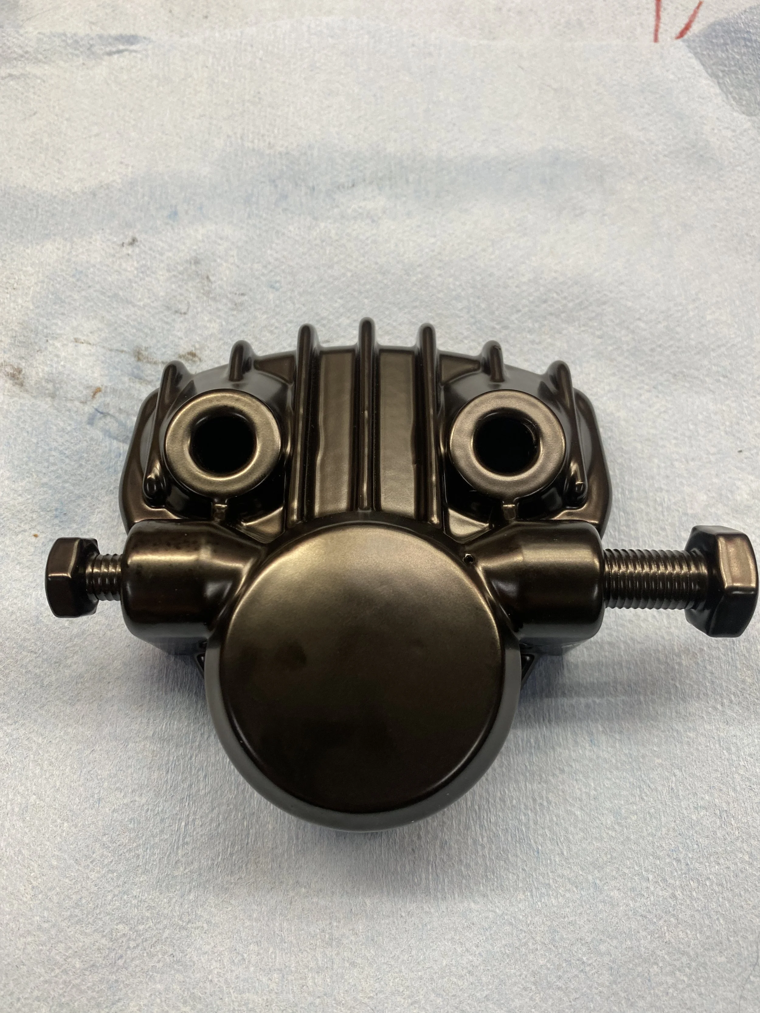 Semi finished article, since there's likelihood of very destructive liquid getting out and stripping all the paint off I don't paint the caliper until I'm sure it works liquid tight. Regardless of how it looks the double disc set up works fantastic.